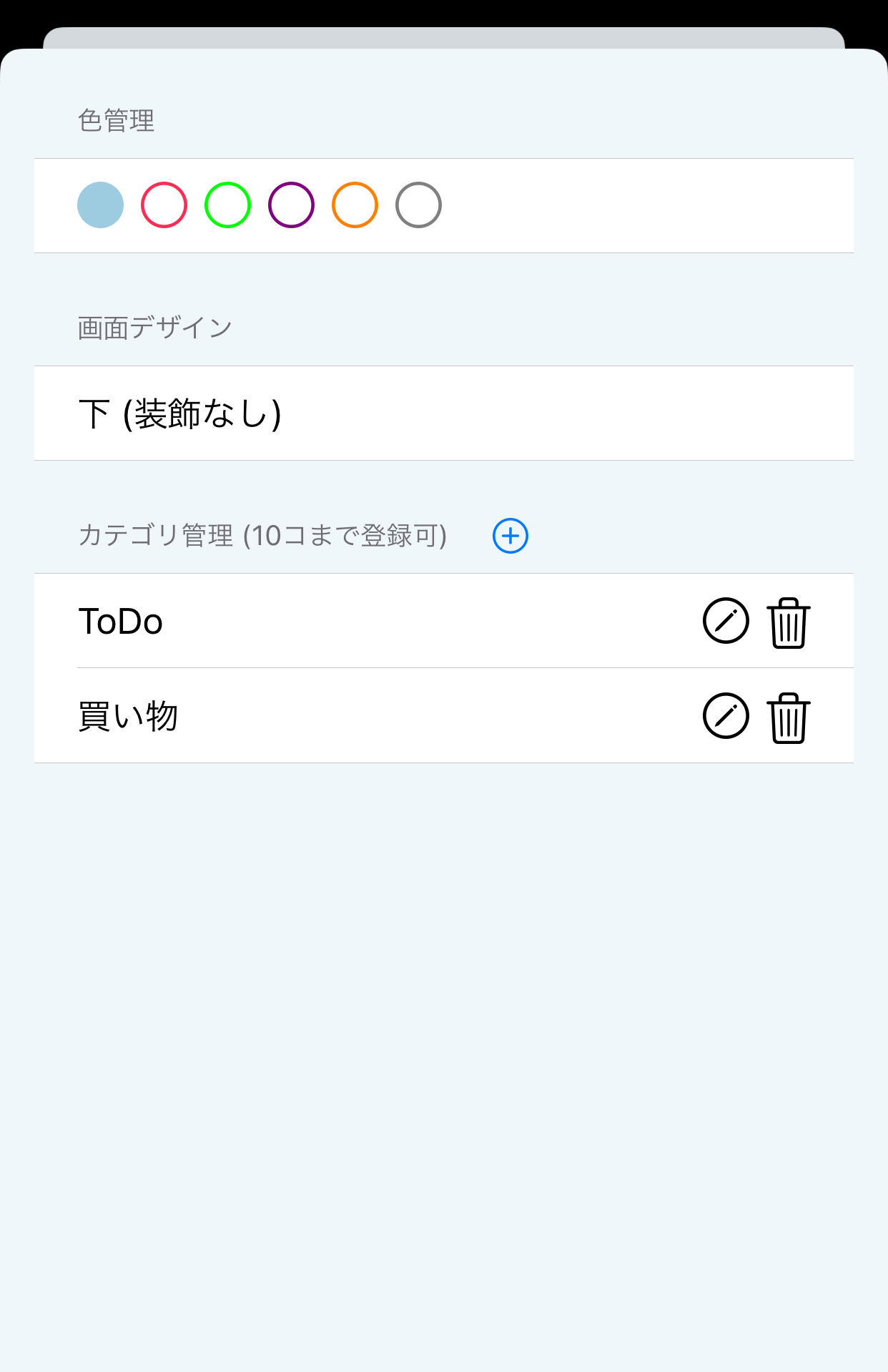 ● カテゴリ管理横の「+」ボタンでカテゴリ追加 (最大10コまで。各カテゴリの最大文字数は10文字)
